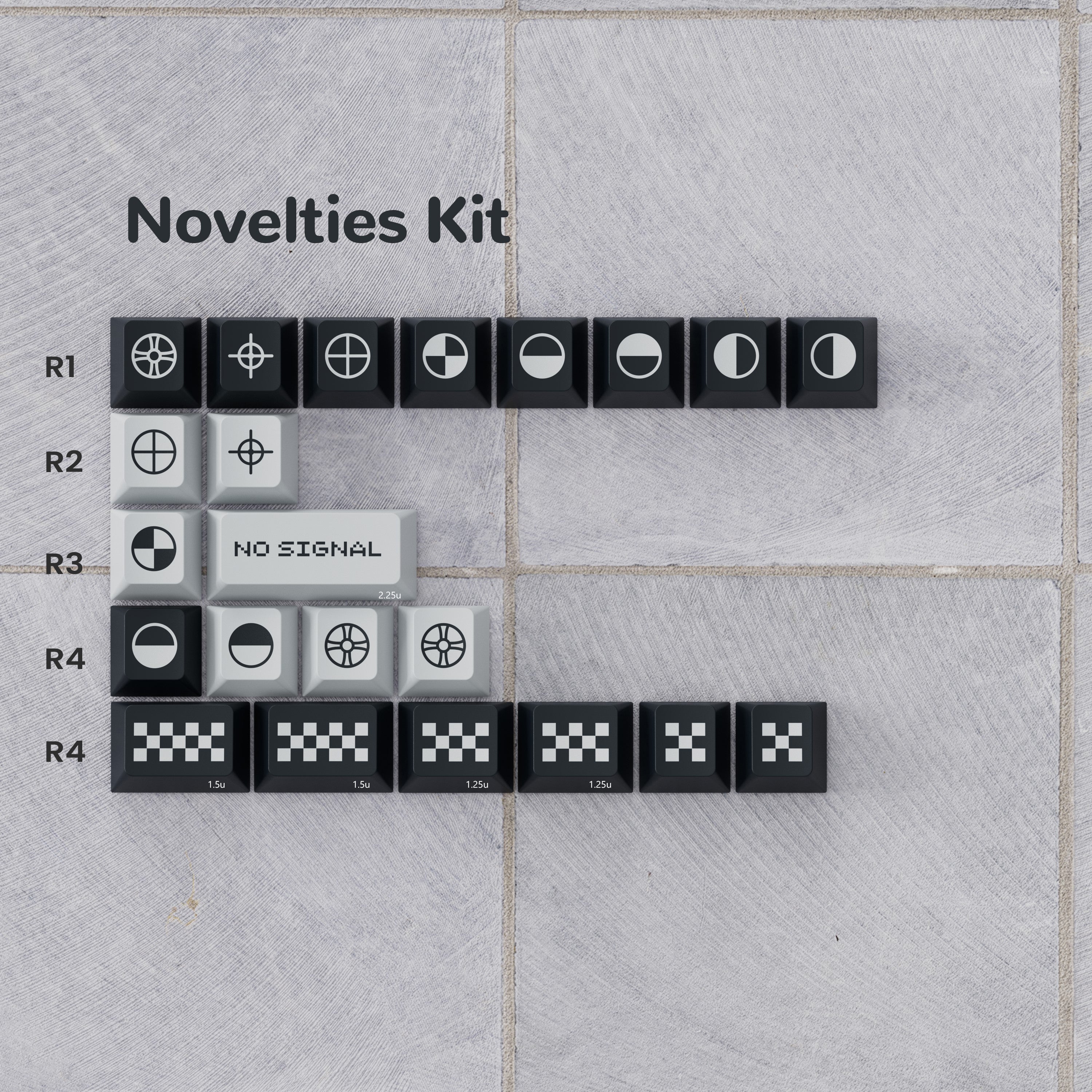 The set draws its inspiration from the popular Electronically generated test patterns which were used to calibrate televisions, in particular, its colors and graphic elements. The keyboard, once assembled, therefore becomes a calibration tool in turn. The graphic elements are inspired by direct references to different types of test patterns: The Indian-head test pattern, SMPTE color and undoubtedly the most famous and iconic of all the PTV Circle pattern. Initially the test cards were displayed when the television channel had not yet started its programs. Used as a signal, they can appear during unforeseen events: breakdowns, staff strike, signal cut, power cut, regional stall, etc... Those are now part of popular culture, although sometimes diverted from their original use, we can spot them in current productions such as Fallout 4 with its iconic test card (based on The RCA Indian-head test pattern) or Life on Mars with the use of the BBC Test card F. ———Biip